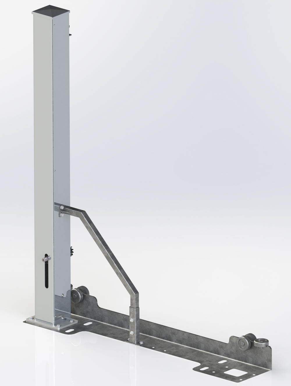Element montażowy przeznaczony do stabilizacji słupa bramy z wózkami zespolonymi. Utrzymuje słup w pionie i zapobiega jego drganiom podczas pracy bramy, co zapewnia długą i bezawaryjną eksploatację całego systemu.