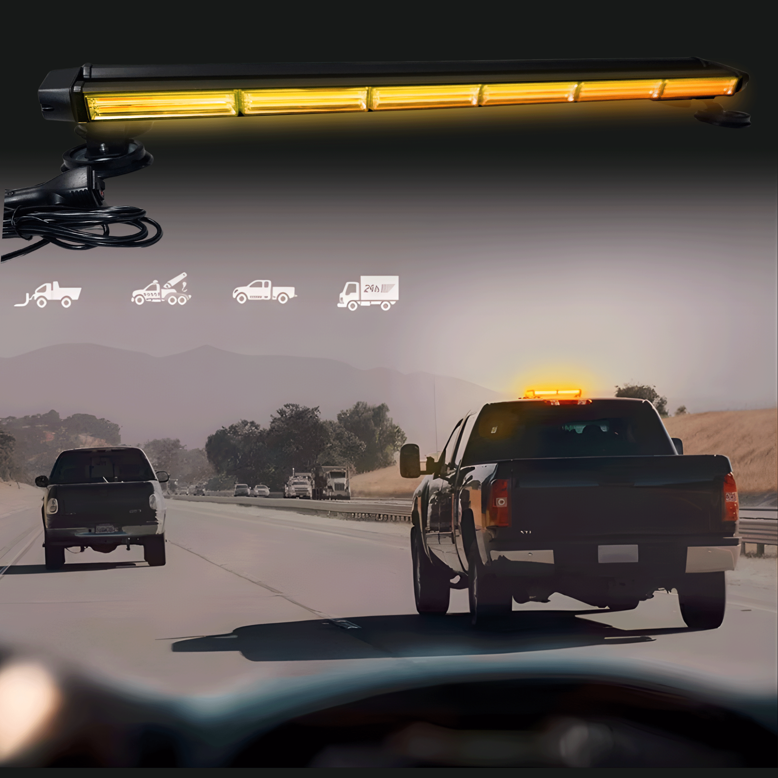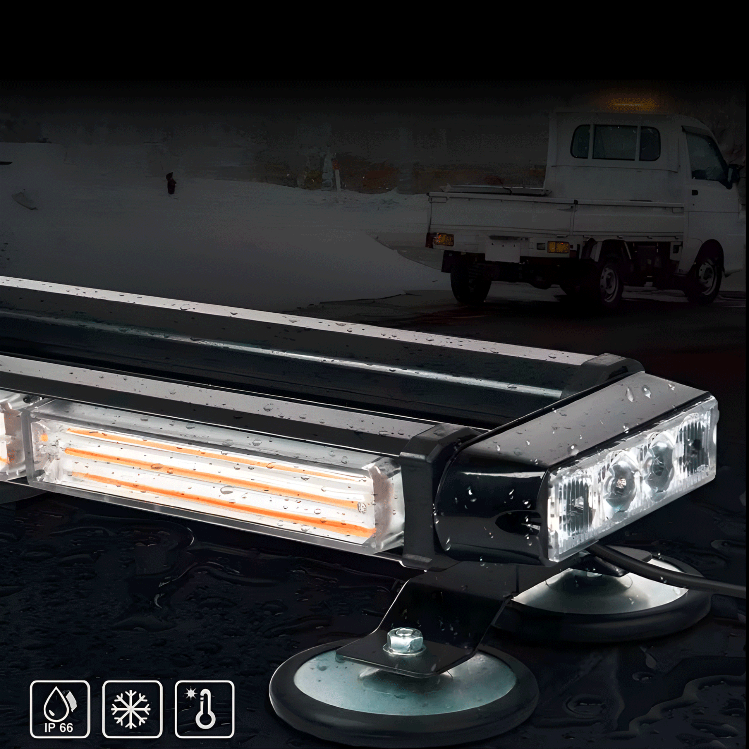 Profesjonalna lampa ostrzegawcza LED przeznaczona do montażu dachowego na pojazdach specjalnych, uprzywilejowanych oraz technicznych, takich jak samochody służb drogowych, pojazdy budowlane, rolnicze, leśne czy auta eskortowe. Urządzenie charakteryzuje się wysoką jasnością, bardzo dobrą widocznością nawet w trudnych warunkach pogodowych (mgła, deszcz, noc), długą żywotnością oraz solidną, odporną na uszkodzenia konstrukcją. Dzięki zastosowaniu silnych magnesów montażowych, możliwy jest szybki montaż i demontaż bez ingerencji w karoserię pojazdu. Obudowa wykonana z wytrzymałych materiałów gwarantuje odporność na wodę, kurz i wibracje, co czyni lampę idealną do intensywnego, codziennego użytkowania. Urządzenie zużywa minimalną ilość energii, zapewniając jednocześnie ciągłą i niezawodną pracę. W zależności od wersji, dostępne są różne tryby świecenia: światło ciągłe, błyskowe oraz stroboskopowe, co pozwala dostosować działanie lampy do specyfiki zadania i rodzaju pojazdu.