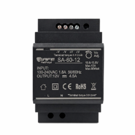 Zasilacz napięciowy DIN SA-30-12 60W 12V 4.5A do zastosowania m.in. w instalacjach wideodomofonów, domofonów, systemów kontroli dostępu, systemach elektroniki przemysłowej itp. Generuje 60W mocy i do 4.5A prądu. Zasilacze na szynę DIN stosowane są wszędzie tam, gdzie potrzebna jest minimalizacja miejsca zajmowanego przez zasilacz. Obudowa przeznaczona jest do montażu na szynie DIN, której szerokość powinna wynosić 35 mm (DIN TS-35/7.5 lub 15). Odpowiednie zaczepy umożliwiają szybki i komfortowy montaż.